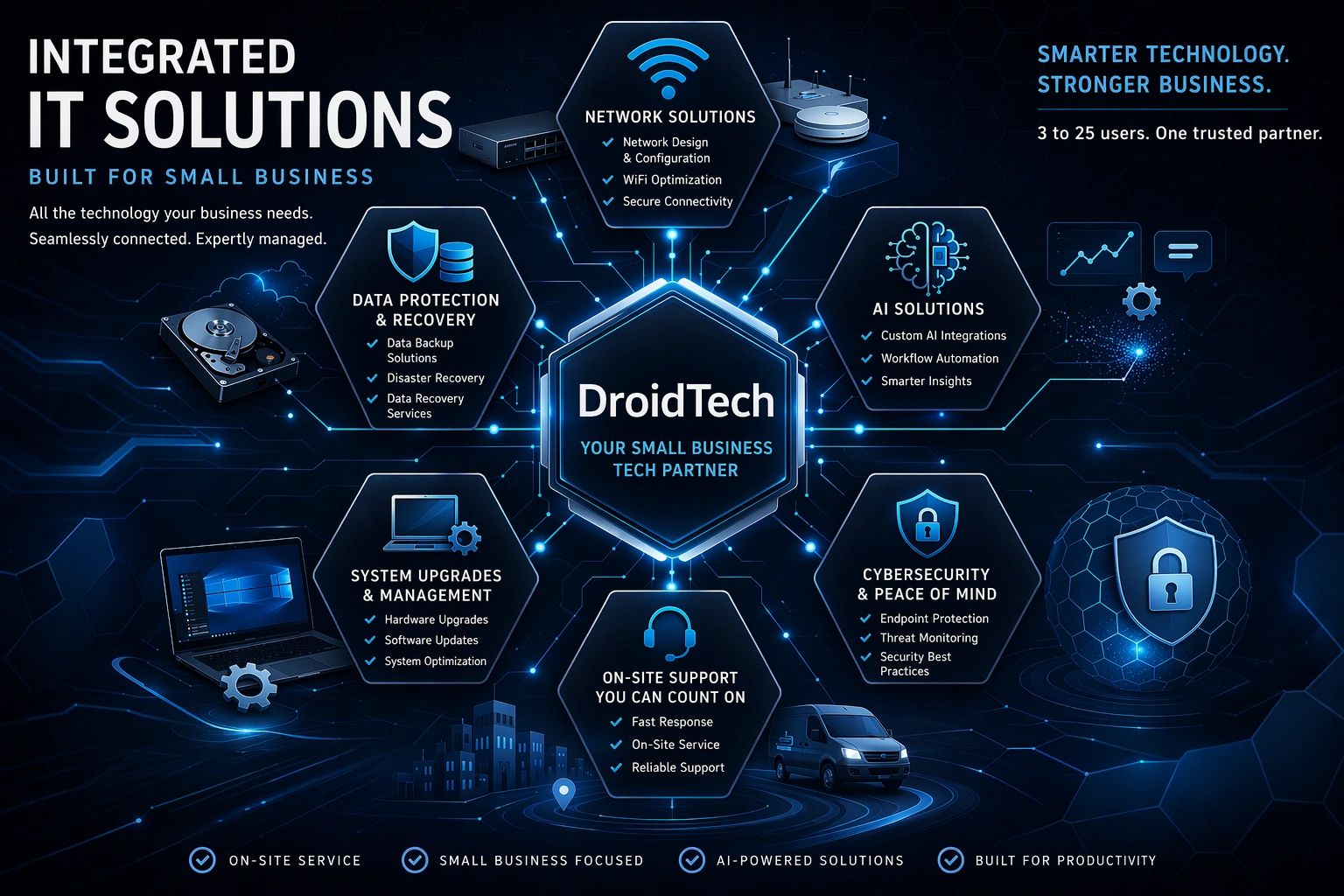 At DroidTech, we offer comprehensive on-site IT support tailored for small businesses. Our team ensures your technology runs smoothly, minimizing downtime and maximizing productivity with prompt service.